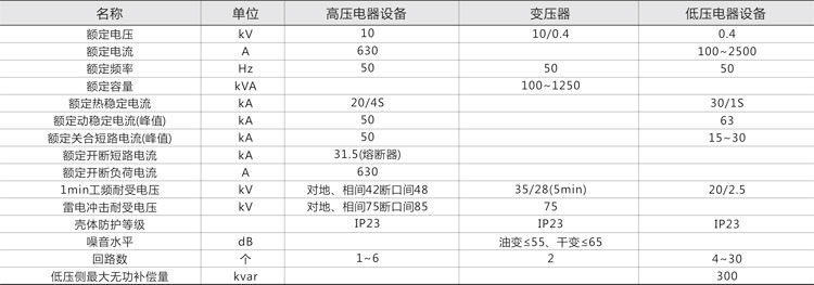 1. 本產(chǎn)品由高壓配電裝置、變壓器及低壓配電裝置聯(lián)接而成,分成三個(gè)功能隔室,即高壓室、變壓器室和低壓室,高、低壓室功能齊全,高壓側(cè)一次供電系統(tǒng),可布置成環(huán)網(wǎng)供電、終端供電、雙電源供電等多種供電方式,還可裝設(shè)高壓計(jì)量元件,滿足高壓計(jì)量的需求。變壓器室可選擇S9、SC以及其他系列低損耗油浸式變壓器或干式變壓器;低壓室根據(jù)用戶要求可采用面板或柜裝式結(jié)構(gòu)組成用戶所需供電方案,有動(dòng)力配電、照明配電、無(wú)功功率補(bǔ)償、電能計(jì)量和電量測(cè)量等多種功能,滿足用戶的不同要求。并方便用戶的供電管理和提高供電質(zhì)量。