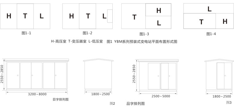 YBM系列預(yù)裝式變電站,根據(jù)排列方式分“目”字形排列(圖1-1、圖1-2);“品”字形排列(圖1-3、圖1-4)。外形尺寸見(jiàn)圖2、圖3。
